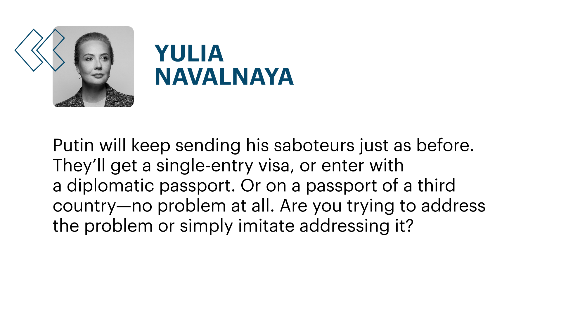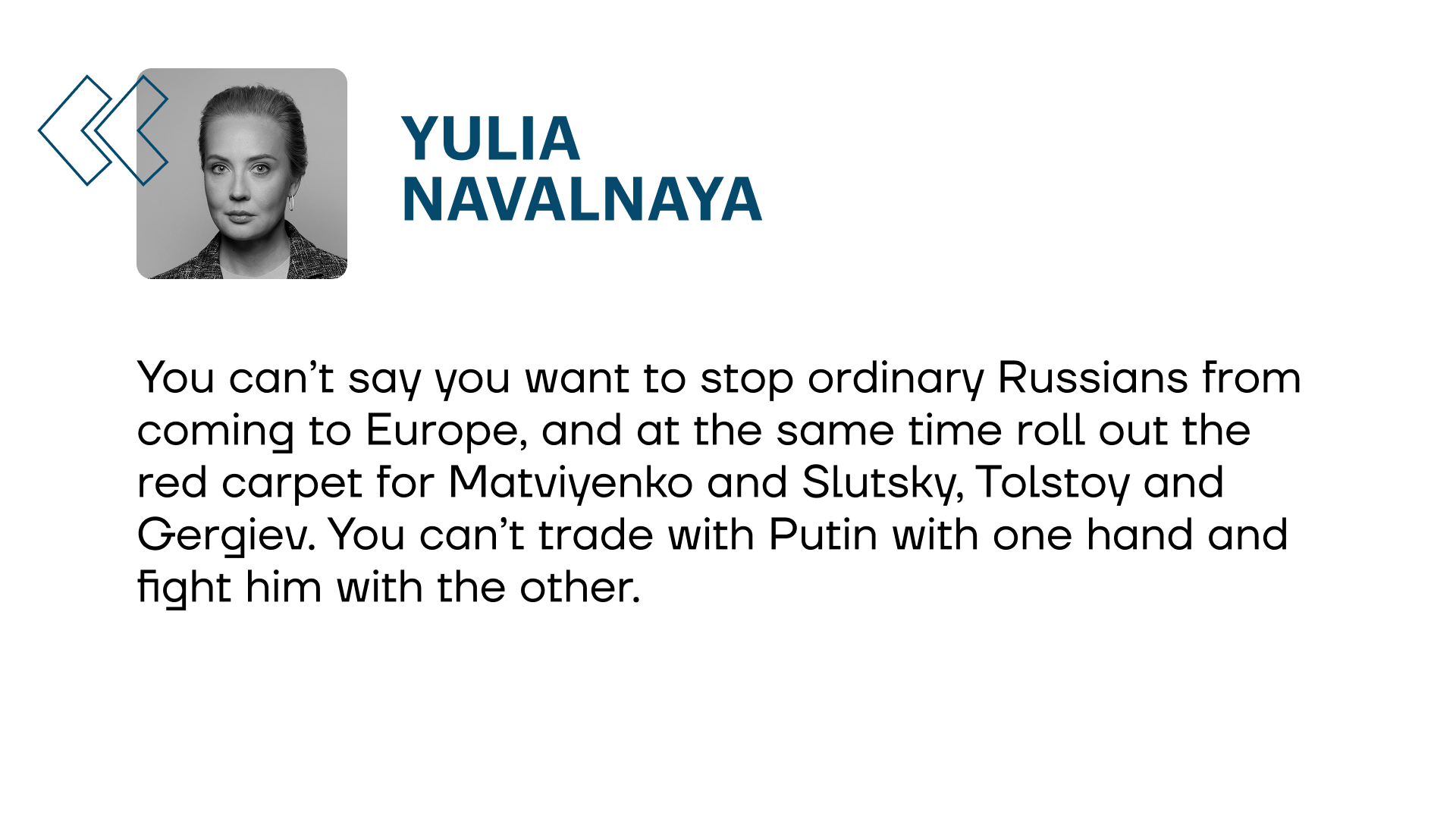 Yulia Navalnaya criticises the policy of double standards, where ordinary Russians are restricted while Putin’s officials and oligarchs continue to travel and trade with Europe:
