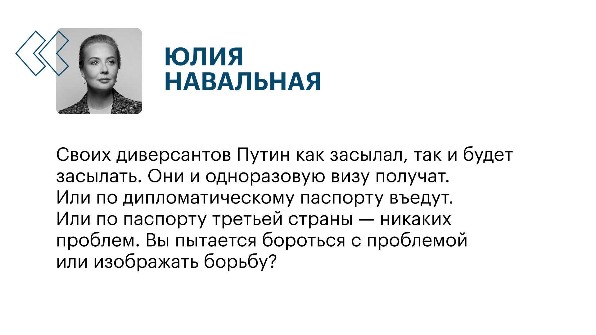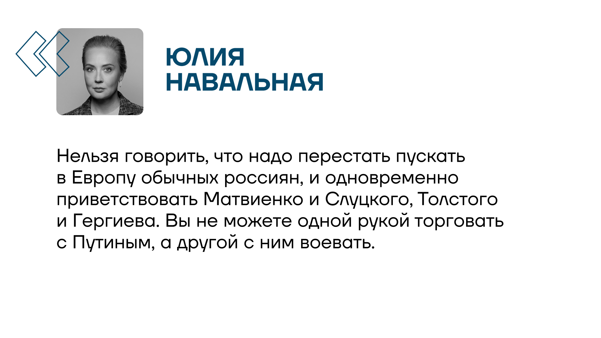 Юлия Навальная записала обращение о решении Еврокомиссии лишить россиян шенгенских мультивиз и назвала его примером имитации борьбы с Путиным. Представлять визовые ограничения как санкции против Путина неправильно.